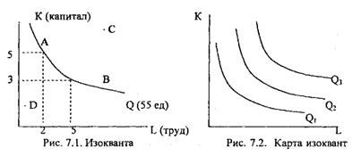 Графическим изображением производственной функции является изокванта - кривая, на которой расположены все сочетания производственных факторов, обеспечивающих одинаковый объем выпуска продукции.