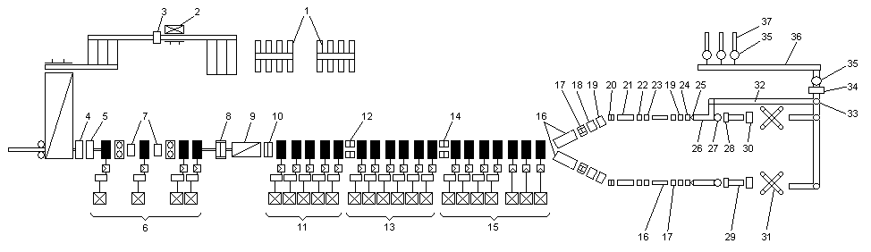 1 - зачистные наждачные станки, 2 - карман для бракованных заготовок, 3 и 30 - весы, 4 - вытаскиватель, 6 - обжимная группа клетей 630, 8 - маятниковые летучие ножницы, 9 подогревательная печь, 10 и 20 - разрывные ножницы,11- черновая группа клетей 450,12 - кривошипно-рычажные 0,4-МН ножницы, 13 - первая промежуточная группа клетей 380, 14 - кривошипные 97,5-кН ножницы, 15 - вторая промежуточная группа клетей 320, 16 - установки водяного охлаждения, 17 - дисковые ножницы, 18 - скрапные ножницы, 19 - кривошипные ножницы,21 - десятиклетевой чистовой блок клетей, 22 - измеритель толщины, 24 - трайб-аппарат, 25 виткообразователь, 26 - транспортер с воздушным охлаждением, 27 - виткосборник, 28 - делительные ножницы, 29 - транспортер, 31 пресс с вязальными машинами, 32 - транспортер поддонов, 33 - опрокидыватель, 34 - тележка для съема бунтов, 35 съёмная серьга, 36 - цепной транспортёр, 37- пластинчатый транспортёр.