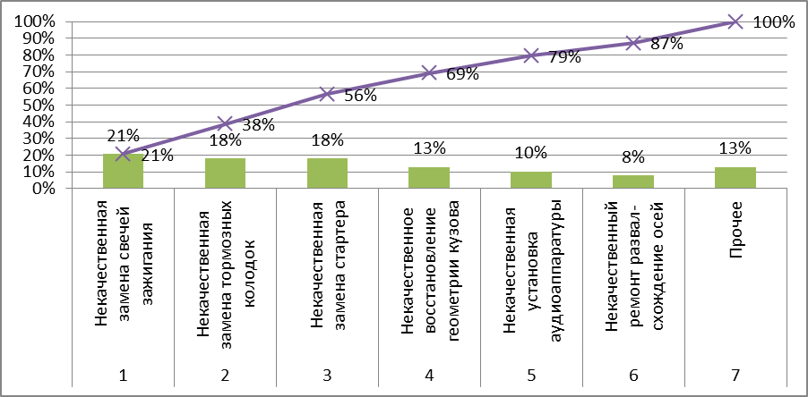 Использование контрольного листка позволяет определить приоритеты проблемных областей в рамках заданного бизнес-процесса для обеспечения акцентов в работе по совершенствованию. Данный контрольный листок позволяет определить качество работы каждого сотрудника по основным видам услуг предприятия. Такой контрольный листок позволяет более качественно делегировать полномочия между сотрудниками участка для качественного оказания услуг заказчикам. Диаграмма Парето является наглядным изображением информации, чтобы из многочисленных факторов, оказывающих влияние, выбрать те факторы, которые имеют наибольшее значение.