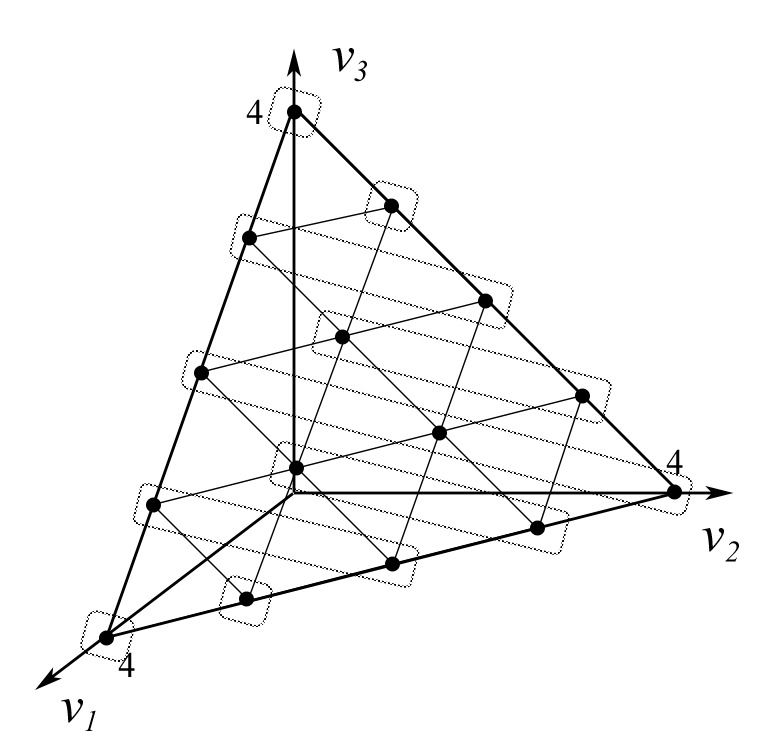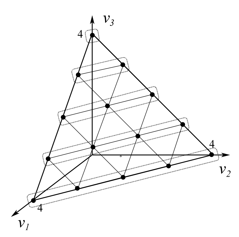 Рассмотрим пример для и . На рисунках 1-3 изображены симплексы . Каждая точка на симплексе соответствует некоторому вектору . На рисунке 1 множества точек, объединенных в группы, - классы эквивалентности по рангу Борда, . Аналогично, классы эквивалентности по правилу простого большинства и по правилу одобряющего голосования с квотой изображены на рисунках 2 и 3.