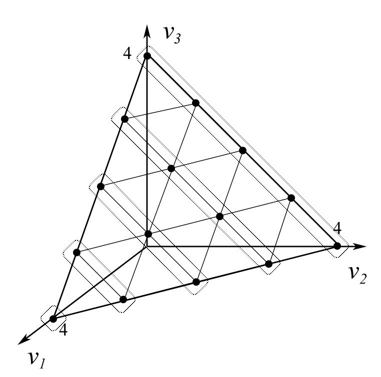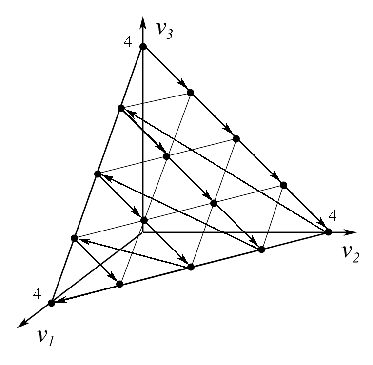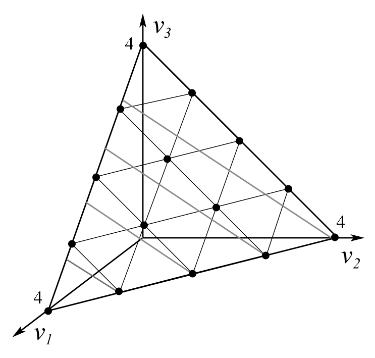 Случай с тремя градациями оценок, , дает возможность наглядно продемонстрировать построение классов эквивалентных векторов оценок. Правило простого большинства и правило одобряющего голосования с квотой 1 являются двумя крайними случаями ранговых процедур и составляют базис пространства векторов весов для . Эквивалентные векторы оценок расположены на линиях уровней . Таким образом, угол под которым в симплексе идут линии уровня любого рангового правила, будет находиться между углами линий уровня правил простого большинства и правила одобряющего голосования.