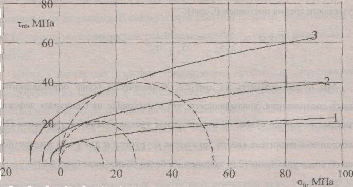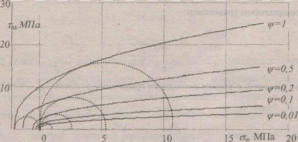 Таким образом, мы получили уравнение обобщенного паспорта прочности трещиноватого массива с открытыми хаотически распределенными трещинами. Таким же образом решаются и более сложные задачи расчета прочности свойств массива с самыми разнообразными трещинами и условиями изменения сплошности по мере увеличения размеров массива. На рис. 2.3 можно проследить, как изменяется паспорт прочности алевролита, если в нем присутствуют открытые трещины различной интенсивности (пустоты), вызывающие уменьшение сплошности породы.