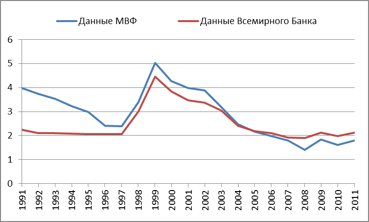 Источник: расчёт авторов на основании данных МВФ (http://elibrary-data.imf.org) и Всемирного Банка (http://data.worldbank.org).