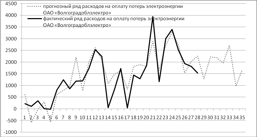Применение математической модели Тейла-Вейджа к прогнозированию убытков сетевой компании позволяет строить гораздо более точный прогноз по сравнению с методикой прогнозирования, используемой ОАО «Волгоградоблэлектро». Погрешность прогноза упадет с 80 % до 19 %. Точность предлагаемого прогноза хорошая, что проиллюстрировано на рис. 1.