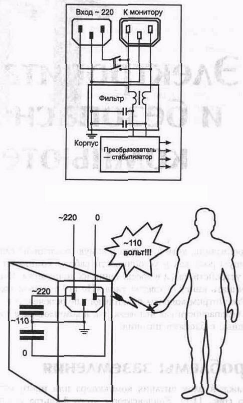 где Uпит =220 В, F=50 Гц частота питающей сети, С емкость конденсатора фильтра. При емкости конденсатора С=0,01 мкФ этот ток будет около 7 мА. Во-первых, это напряжение (и такой ток) опасно для человека, а попасть под него можно, прикоснувшись одновременно к неокрашенным металлическим частям корпуса компьютера и, например, к батарее отопления. Во-вторых, это напряжение и является одним из источников той самой разности потенциалов между устройствами, от которой страдают интерфейсные схемы.