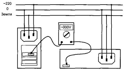 При соединении двух устройств (например, компьютера и принтера) интерфейсным кабелем происходит следующее. Общий провод интерфейсов последовательных и параллельных портов связан со «схемной землей» и корпусом устройства. Если соединяемые устройства надежно заземлены (занулены) через отдельный провод на общий контур (рис. 3), то проблемы разности потенциалов не возникает.