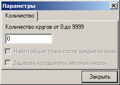 Параметр «Найти общие точки после закрытия окна» предназначен для определения общей точки для всех кругов сразу после закрытия окна Параметры. Если этот параметр не доступен для изменения и его текст горит серым цветом то вывод сообщения информирующее пользователя об общей точки сразу после закрытия окна, выполняться не будет. Параметр недоступен в случае, если пользователь ввел меньше двух кругов в поле для ввода кругов.