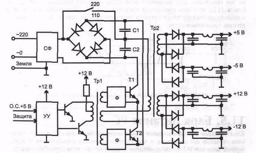 Рис. . Двухтактный блок питания PC: СФ сетевой фильтр, УУ устройство управления, Ф формирователи импульсов, Тр1 трансформатор развязки цепей управления, Тр2 силовой трансформатор