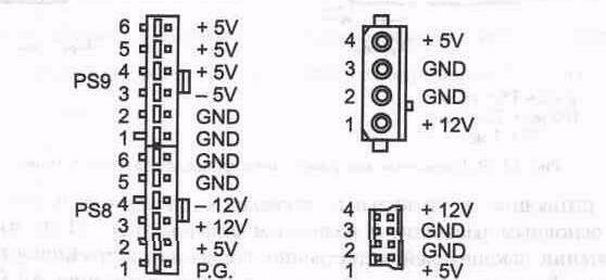Выходные цепи блоков питания формата AT выводятся гибкими жгутами проводов со стандартным набором разъемов (рис. ). Разъемы для питания накопителей имеют ключи, исключающие возможность неправильного соединения. Однако иногда встречаются блоки с ошибочно собранными разъемами, в результате чего на шину питания +5 В попадает +12 В, чего устройства, как правило, не выдерживают. Традиционные разъемы питания системной платы PS-8, PS-9 всегда устанавливаются рядом так, чтобы четыре черных провода GND шли подряд. Их ключи весьма условны, а ошибка подключения чревата выгоранием системной платы. Цвета проводов в жгутах стандартизованы: