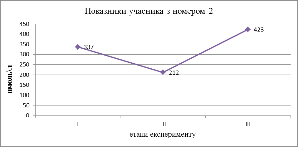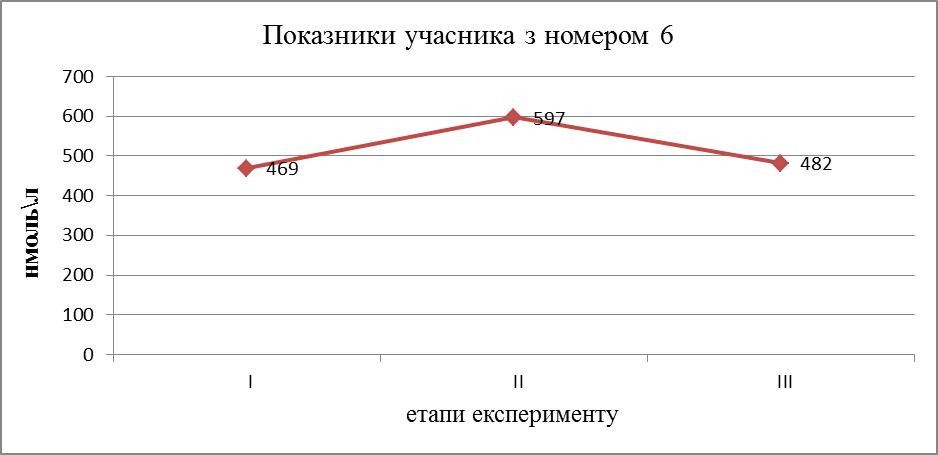 У віддалений термін через два тижні під дією факторів навколишнього середовища в деяких піддослідних, а саме номер 1, 6, 2 кортизол був в межах вихідних значень, у решти учасників, з порядковим номером 3, 4, 5 він дещо підвищився порівняно з вихідним рівнем, в даному випадку істотну роль зіграв фактор навколишнього середовища.
