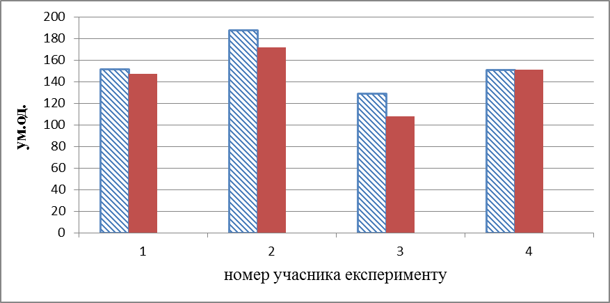 Як ми бачимо, зміна гормону в сироватці крові неоднозначна. Тому доцільно розділити випробовуваних на дві умовні групи: перша це учасники, у котрих рівень гормону після короткострокового впливу знизився, а друга група учасники зі збільшенням рівня кортизолу.