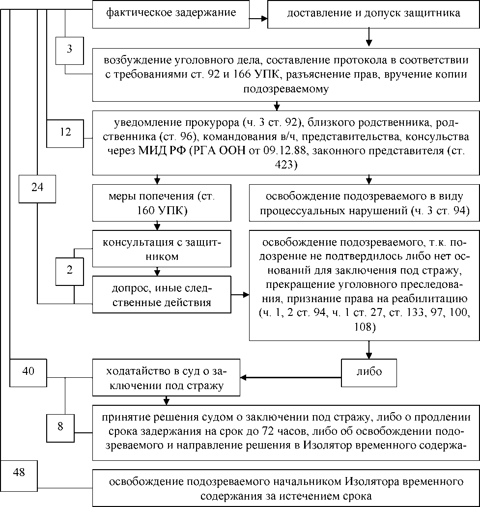 - наличию оснований и соблюдению порядка задержания подозреваемого (статьи 91 и 92 УПК РФ), в частности, наличию оснований, предусмотренных статьей 100 УПК РФ, для применения меры пресечения до предъявления обвинения и соблюдения порядка ее применения;