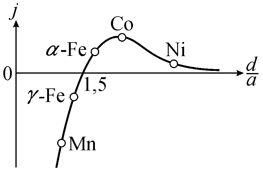 Установлено, что значение обменного интеграла J зависит от отношения межатомного расстояния d к диаметру a недостроенной внутренней электронной оболочки атома вещества (рис. 6). Ферромагнетизм наблюдается только для элементов, у которых обменный интеграл положителен (J > 0), что выполняется для d/a > 1,5. Например, из элементов группы железа ферромагнетиком является только альфа-железо (a-Fe), кобальт (Co) и никель (Ni). Гамма-железо (g-Fe) и другие элементы этой группы ферромагнетиками не являются. Однако, в ряде случаев при изменении постоянной решетки за счет легирования другим элементом можно добиться того, что данный элемент (слабо легированный) становится ферромагнетиком. Такой эффект наблюдается у марганца (Mn) при легировании его азотом в малых концентрациях, когда отношение d/a оказывается порядка 1,5.