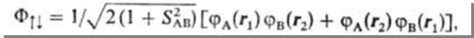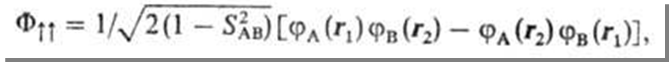-интеграл перекрывания электронных волновых функций атомов А и В (см. Молекулярные интегралы). Полная волновая функция системы является антисимметричной относительно перестановок электронов (т.е. меняет знак при таких перестановках) и строится из произведений пространственных (координатных) функций
