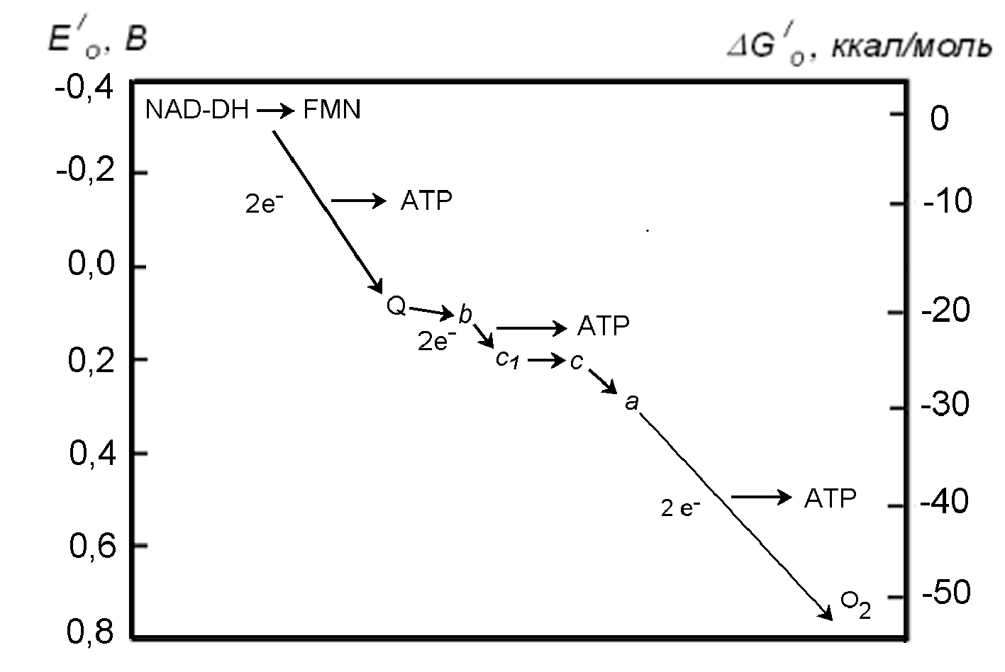 показывает ускорение электронного потока по мере приближения к конечному звену, особенно после цитохрома с1. Если в клетках достаточно кислорода, то все цитохромы почти все время находятся в окисленном состоянии (без электронов).