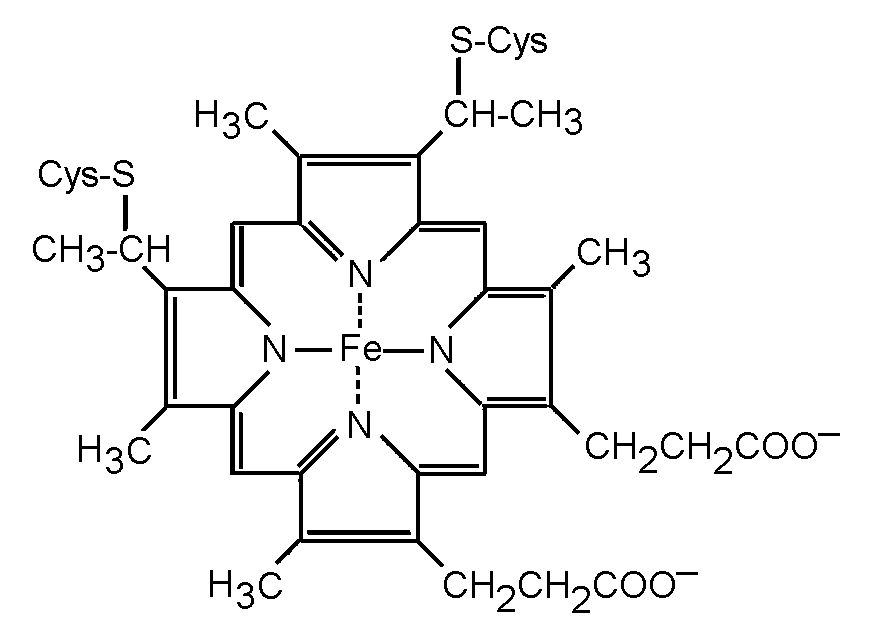 Цитохромы - это группа белков, содержащих в качестве коферментов гем (Рис.16). В геме порфириновое кольцо содержит в центре ион железа, способный легко присоединять электрон (и при этом восстанавливаться) или отдавать e- (и при этом окисляться), переходя от ферри-формы (Fe3+) к ферро-форме (Fe2+) и наоборот: