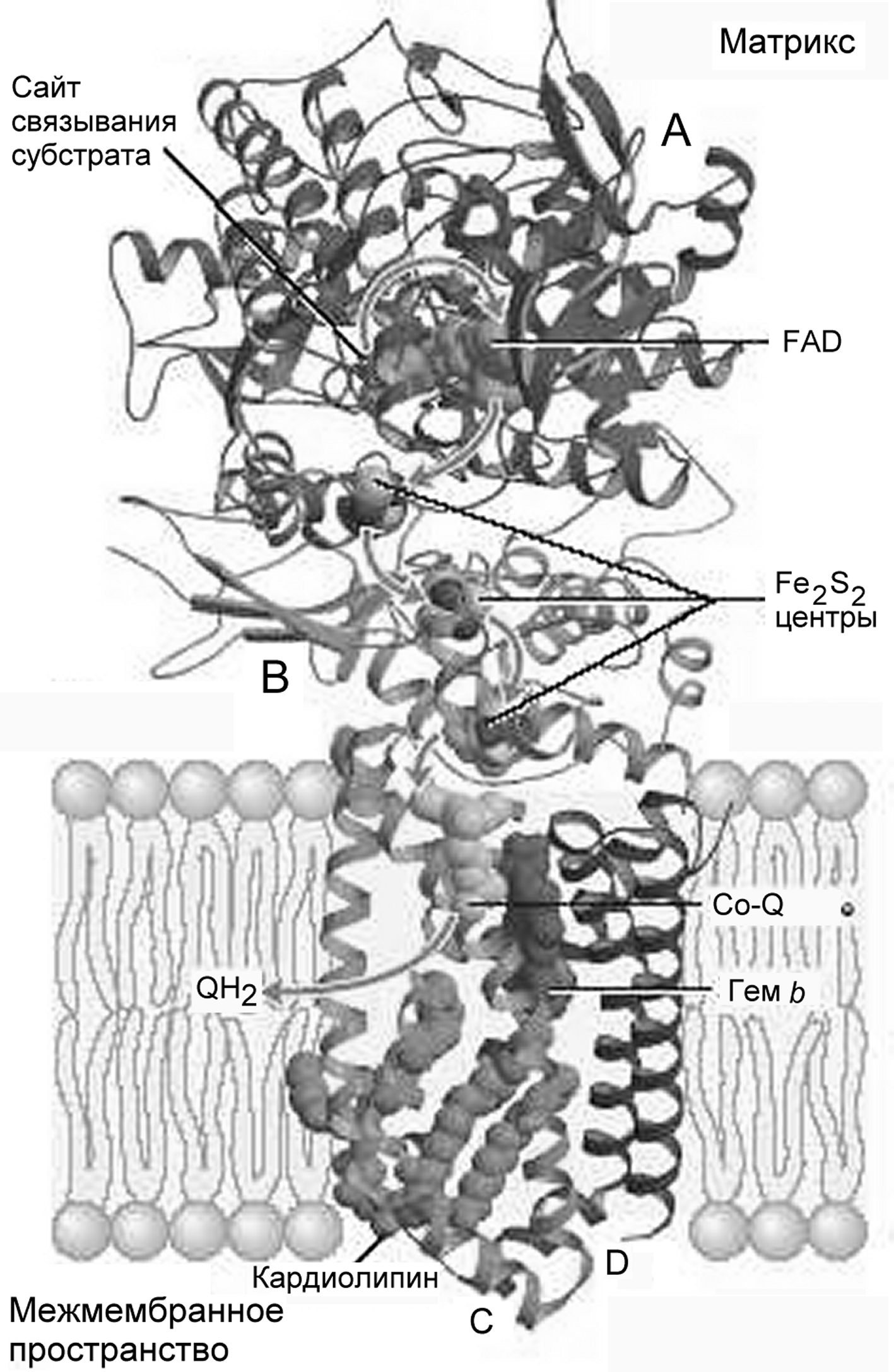 Пространственная структура комплекса II недавно расшифрована. Он состоит из 4 субъединиц с общей массой 140 кДа (Рис.20). Его субъединицы A и B простираются далеко в матрикс. Субъединица A содержит сайты связывания сукцината и FAD, субъединица B - три (Fe2-S2)-центра. Субъединицы C и D - интегральные белки, состоящие из трех внутримембранных -спиралей, встроенных во внутреннюю митохондриальную мембрану. Они содержат гем и центр связывания CoQ. Комплекс II получает электроны от сукцината и переносит их на CoQ. Расстояние в нем между FAD и сайтом связывания сукцината, или между FAD и центром связывания CoQ превышает 4,0 нм и, казалось бы, электронный транспорт на такое расстояние маловероятен. Но между ними, видимо, располагаются (Fe2-S2)-центры, играющие роль промежуточных переносчиков, расстояния между которыми не больше 1,1 нм, что позволяет эффективно переносить электроны.