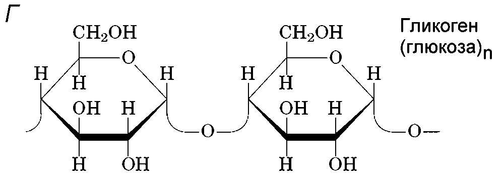 Рисунок 5 - Глюкоза может существовать в линейной (А) или кольцевой форме (Б или В). Структура В («кресло») реальней отображает пространственную конформацию глюкозы, чем структура Б. Такая конформация называется. Г. Гликоген и крахмал полимеры из глюкозы. Крахмал из растительных клеток имеет линейную структуру, а гликоген из клеток животных разветвленную