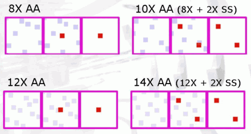 В режимах 8x и 12x обе карты обеспечивают типичный 4x и 6x Multi-Sample AA рендеринг с использованием различных шаблонов, затем результат микшируется в CrossFire Composition Engine. Режимы 10x и 14x представляют собой комбинацию AA режимов 8x и 10x с новой технологией сглаживания 2x Super-Sampling AA. Суперсэмплинг - это то, что доктор прописал для сглаживания зубчиков и текстурных багов, допускаемых при работе имеющегося в каждой карте Multi-Sampling AA. Вне зависимости от использования CrossFire, режимы AA устанавливается как NoAA/2x/4x/6x, а режимы SuperAA - 2x/4x/8x/10x/12x/14x, что означает работу каждого GPU в режиме AA 2x - 7x.