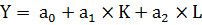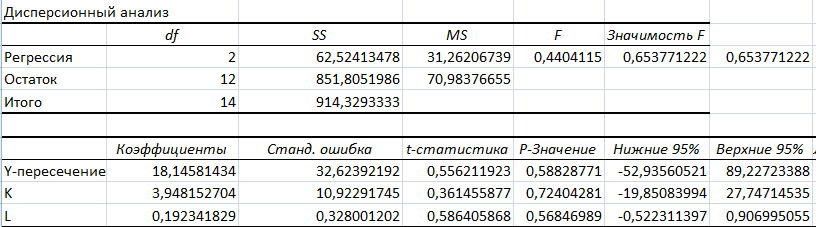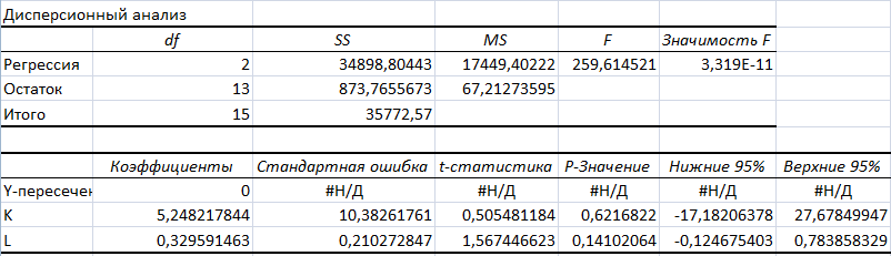 Нормированный R-квадрат скорректированный R2 ; если значение отрицательное, то это говорит о том, что с ростом K и L убывает Y.