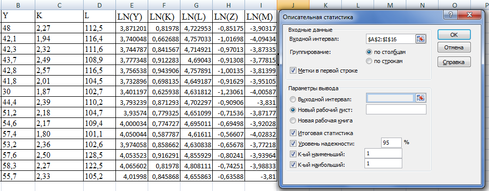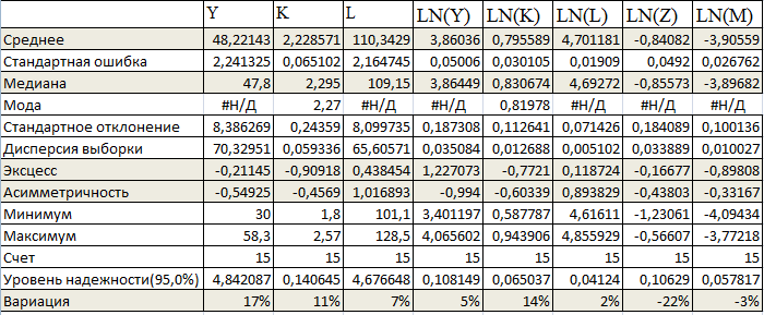 К показателям описательной статистики относятся: среднее, стандартная ошибка, медиана, мода, стандартное отклонение, дисперсия выборки, эксцесс, асимметричность, интервал, минимум, максимум, сумма, счет.