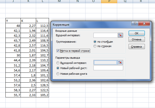 Коэффициенты парной корреляции используются для измерения силы линейных связей различных пар признаков из их множества. Для множества признаков получают матрицу коэффициентов парной корреляции. Вычисляем её инструментом «Корреляция» пакета «Анализ данных». Она симметрична относительно главной диагонали (ryk = rky, ryl = rly, rkl = rlk):