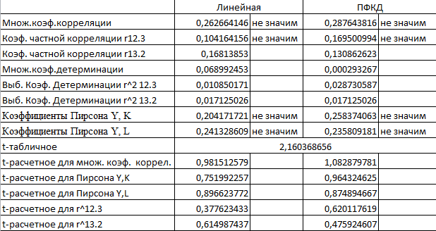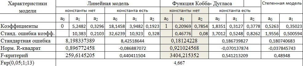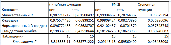 Значимость F для линейной модели с константой равна 0,645, а для ПФКД с константой равна 0,596, для степенной модели равна 0,496, что больше 0,05, поэтому данные модели являются недостоверными.