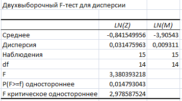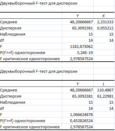 2.3 Выполнение дисперсионного анализа производственных функций процедурой двухвыборочногоF-теста для дисперсий на двухстороннем уровне значимости =0,025………………………………………………..……15