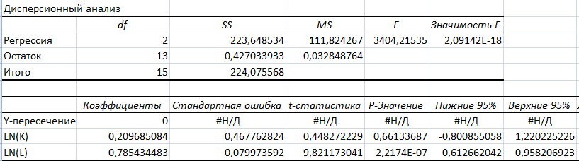 Результаты регрессионного анализа линеаризованной функции Кобба-Дугласа без константы: