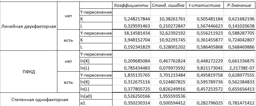 Результаты регрессионного анализа функции Кобба-Дугласа, содержащая константу: