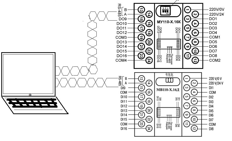 На рисунку 2.4 зображено локальна мережа на основі інтерфейсу RS485, що об'єднує кілька приймально-передавачів. При підключенні слід правильно приєднати сигнальні ланцюга, зазвичай звані А і В. Переполюсовка не страшна, але пристрій працювати не буде.