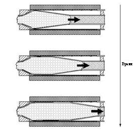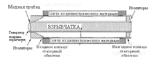 Устройство и принцип действия генератора иллюстрируется рис. 64. Генератор состоит из ротора и статора. В представленном варианте генератора коаксиального типа в качестве ротора используется цилиндрическая медная трубка, заполненная взрывчатым веществом. Статор генератора формируется спиралью из прочного (обычно медного) провода, окружающей ротор. В целях оптимизации электромагнитной индукции в роторе статорная обмотка иногда делится, на секции.