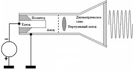Существующие лабораторные источники мощности СВЧ-излучения способны работать как в импульсном (длительностью 10 нс и более), так и в непрерывном режимах и перекрывать диапазон от 500 МГц до десятков ГГц при частотах повторения от единиц до тысяч импульсов в секунду. Максимальная генерируемая при этом мощность достигает уровня нескольких мегаватт (при непрерывном режиме) и нескольких гигаватт (при импульсном режиме). Разумеется, различные типы генераторов в пределах указанных параметров не являются одинаковыми. Так, гиротроны работают в миллиметровом диапазоне волн с высоким КПД, а варакторы в сантиметровом диапазоне и имеют меньший КПД. Для тактического СВЧ-оружия крайне важно, чтобы генераторы были или достаточно широкополосными, или перестраивались в пределах декады. Наибольшей широкополосностью обладают плазменно-лучевые приборы, а легче всего перестраиваются по частоте виркаторы. На рис. 65 показана схема виркатора с соосным виртуальным катодом. По своей конструкции этот виркатор представляет собой круглый волновод, переходящий в конус. Катод представляет собой металлический цилиндрический стержень диаметром несколько сантиметров, анодом является натянутая на обод металлическая сетка. При подаче на анод положительного потенциала порядка 105... 106 В вследствие взрывной эмиссии с катода поток электронов устремляется к аноду и проходит через него в пространство за анодом, где тормозится собственным кулоновым полем и отражается обратно к аноду, образуя виртуальный катод на расстоянии от анода, примерно равном расстоянию от него до реального катода. Отраженные электроны проходят сквозь сетку анода и вновь тормозятся у поверхности реального катода. В результате формируется облако электронов, осциллирующее у анода в потенциальной яме между виртуальным и реальным катодами. На частоте колебаний облака электронов возбуждается СВЧ-поле, которое излучается в пространство через диэлектрическое окно.