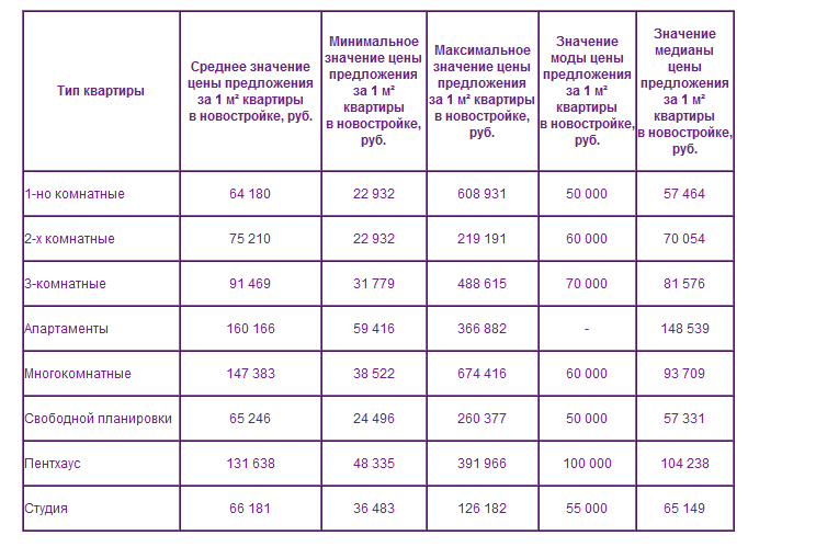 Приложение А. Значение цен предложений квартир в новостройках в зависимости от типа квартиры |