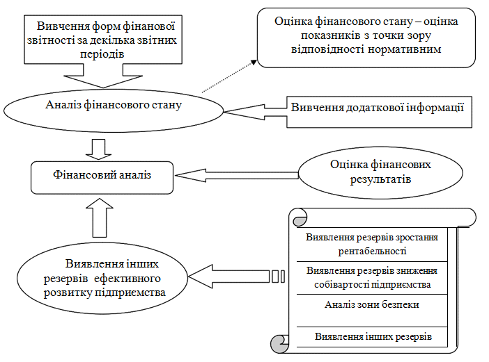 При дослідженні різних підходів щодо визначення змісту оцінки фінансового стану підприємств було уточнено завдання, які повинні вирішуватись в процесі її здійснення. При проведенні оцінки фінансового стану підприємства слід вивчати значення отриманих в результаті аналізу фінансового стану показників, з точки зору відповідності їх фактичних значень нормативним для конкретного підприємства рівням, визначати фактори, що вплинули на величину показника в звітному періоді та здійснювати прогноз її величини на перспективу [11]. При цьому виявлення резервів зростання рентабельності, зниження собівартості та інших резервів ефективного розвитку підприємства є предметом фінансового аналізу (рис. 1.2) [23].