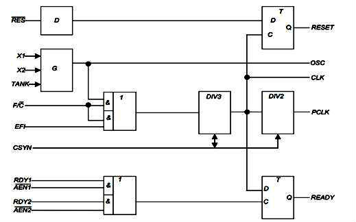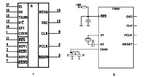 Мікросхема ГФ84 містить схеми задаючого генератора G, дільники частоти на три DIV3 і два DIV2, які разом з логічними елементами виробляють прямокутні імпульси CLK, РСLК і синусоїдальний сигнал OSK. Вони призначені відповідно для тактування роботи мікропроцесора ВМ86,