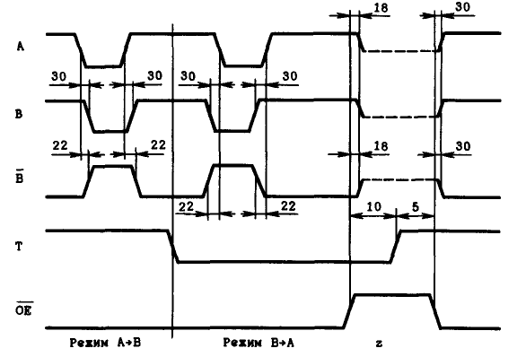 При OE =1 всі SW-схеми знаходяться в Z-стані, при OE=1 і Т=0 обмін даними відбувається в напрямку від А до В. При OE=0 і Т=1 обмін даними відбувається від В до А.