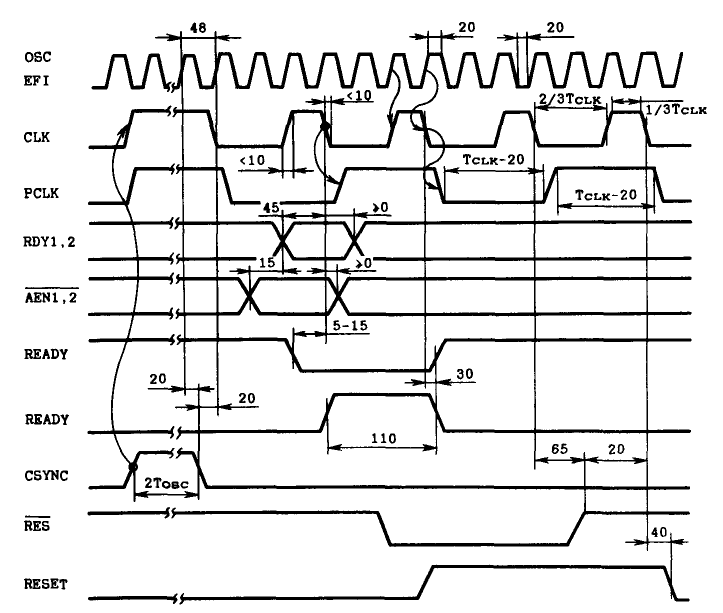 CLK - тактова синхронізація ( тактирование ). Сигнал синхронізації від зовнішнього генератора тактових імпульсів, призначений для синхронізації МП. Використовується серія тактових імпульсів CLK з періодом повторення T, рівним 200 - 500 нс.;
