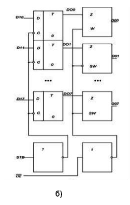 Прямі виходи D07-D00 регістра підключені до буферних схем SW з трьома станами.