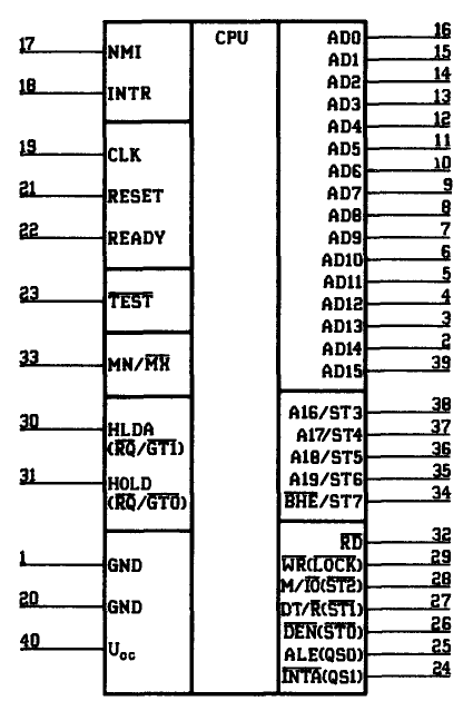 A16/S3, A17/S4, A18/S5, A19/S6 - лінії адреси/стану. В перебігу такту Т1 тримає старші біти адреси при зверненні до памяті чи ВУ, в перебігу Т2, Т3, ТW, T4 інформація про стан МП;
