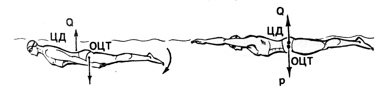 Сила тяжести пловца по величине постоянная и приложена к общему центру тяжести (ОЦТ), находящемуся в области 1 5 крестцовых позвонков. Выталкивающая сила обусловлена разностью гидростатического давления воды на нижнюю часть тела и воздуха на верхнюю, поэтому направлена вверх и приложена к общему центру давления (ОЦД). Обычно ОЦТ и ОЦД не совпадают, поэтому создается момент вращения: ноги постепенно погружаются под воду до их выравнивания по вертикали появляется отрицательная плавучесть. Совпадение ОЦТ и ОЦД ведет к уравновешиванию частей тела и наступает гидростатическое равновесие положение плавучести. ОЦТ всегда стремиться занять более низкое положение, поэтому величина момента вращения определяет устойчивость тела. (рис. №1)