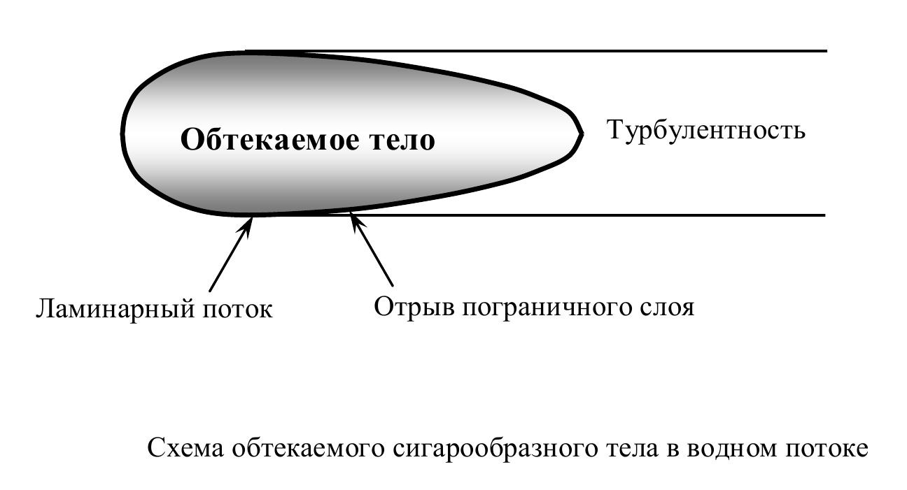 Этот прилегающий к телу слой получил название пограничного. У поверхности тела частицы воды движутся с той же скоростью, что и тело. По мере удаления от тела скорость движения частиц воды снижается до 0 м/с. Если частицы воды движутся не смешиваясь, без завихрений, то такой вид течения жидкости в пограничном слое называется ламинарным. Если эти слои смешиваются, то образуются завихрения и такой вид течения жидкости в пограничном слое называется турбулентным. В турбулентном слое тело испытывает большее сопротивление, чем в ламинарном.