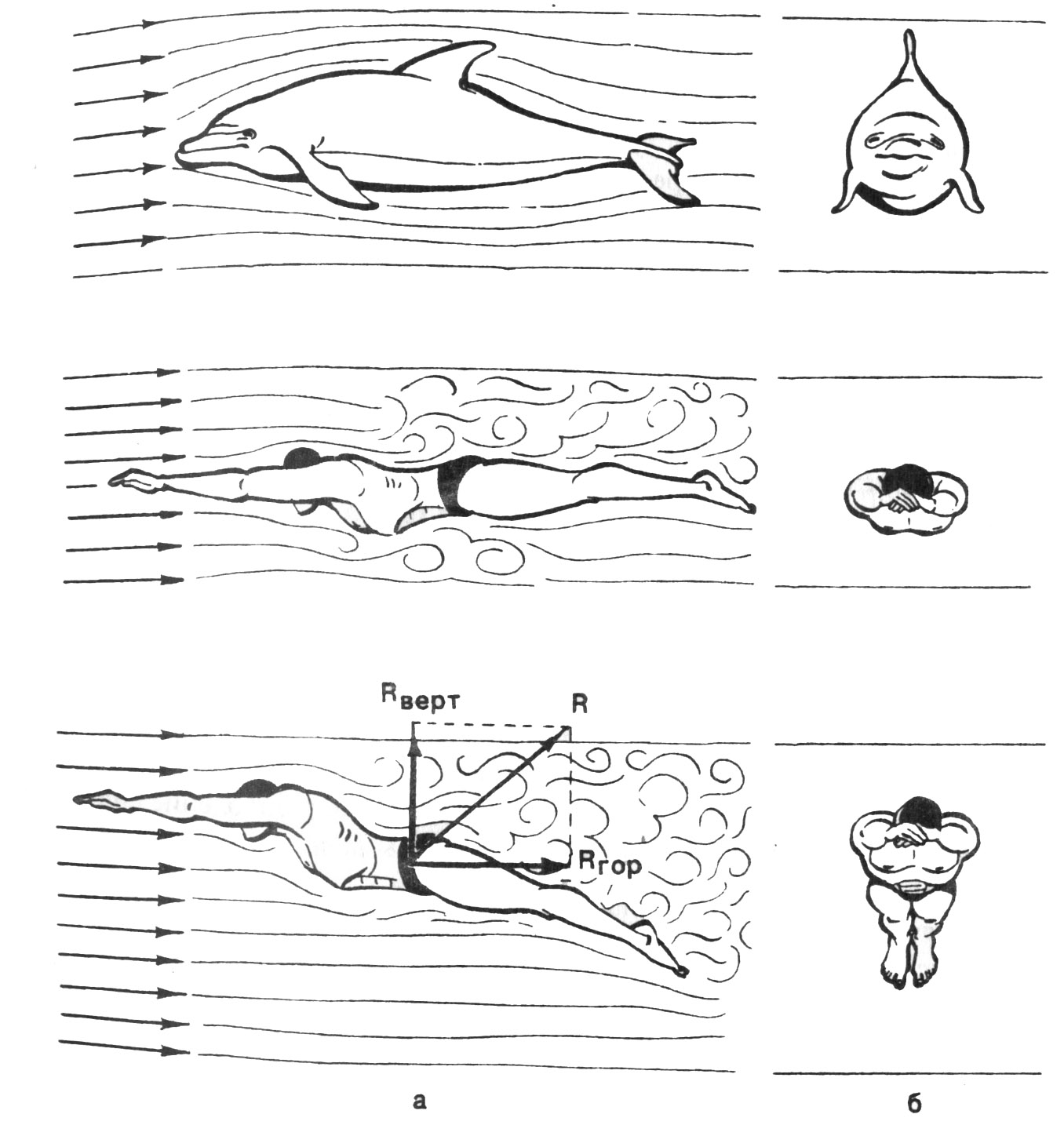 Замена силы R двумя составляющими является условной. В действительности имеется лишь одна сила сила реакции воды. Направление ее действия приближается к перпендикуляру, опущенному на поверхность тела или рабочих звеньев пловца, взаимодействующих с потоком.