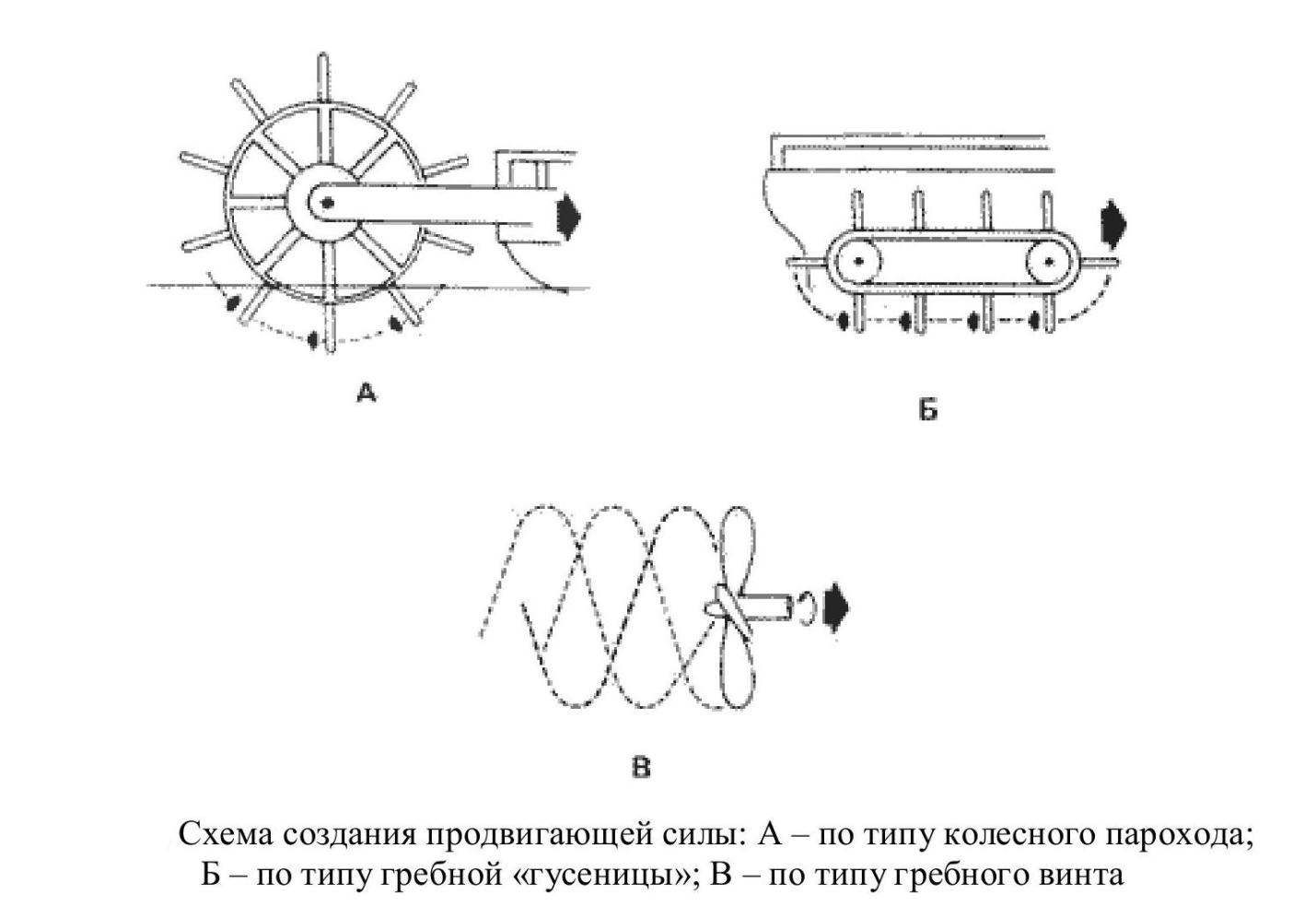 Схема создания продвигающей силы: а) по типу колесного парохода; б) по типу гребной гусеницы; в) по типу гребного винта (рис.3).