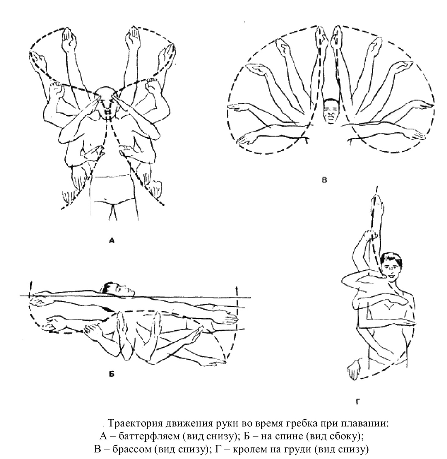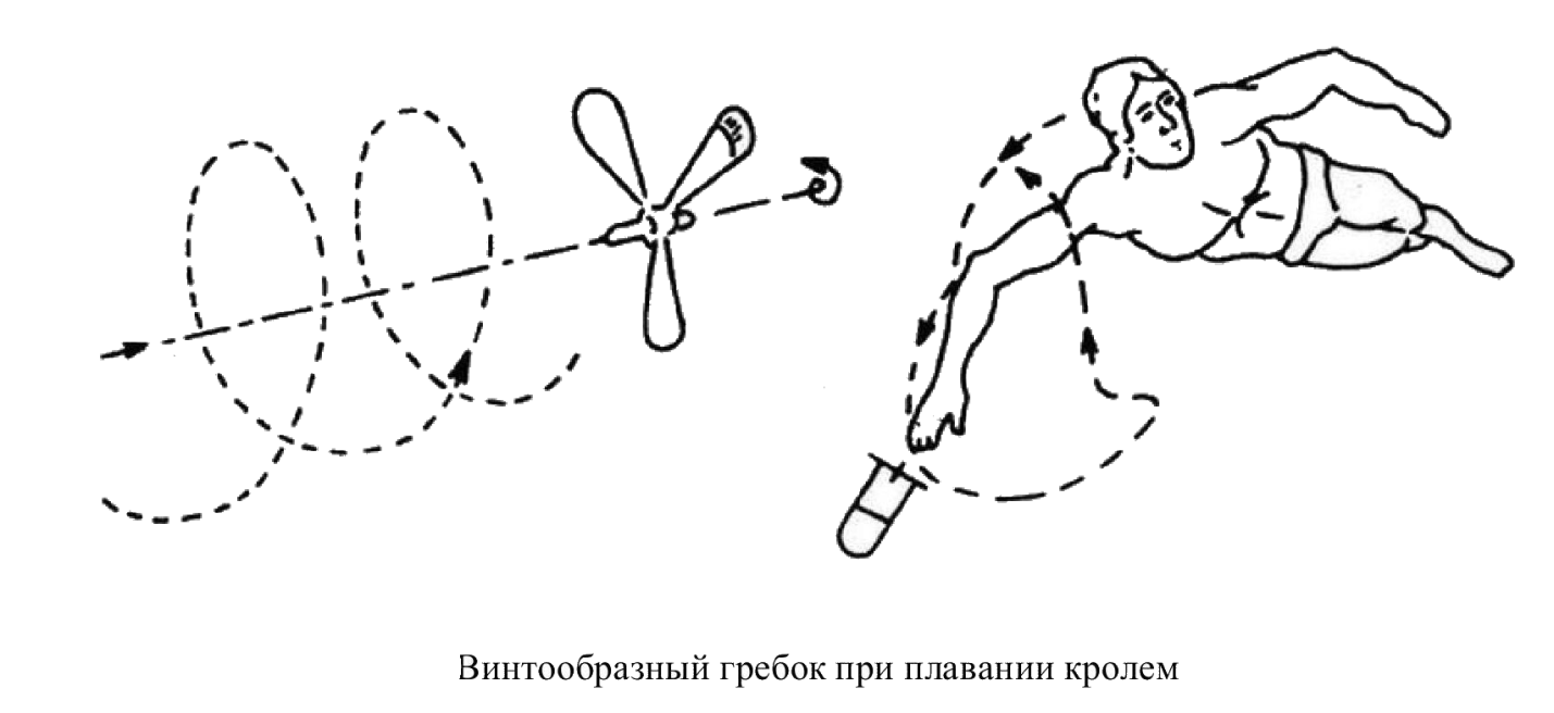 Движения рук пловца подобны вращениям лопастей гребного винта по криволинейной траектории для постоянного контакта с неподвижной массой воды (рис.4). Криволинейная траектория увеличивает длину самого гребка и суммарную движущую силу, создаваемую при выполнении гребка. Биклер (1999) рассчитал, что движущая сила, создаваемая пловцом с помощью криволинейного гребка, лишь немногим меньше движущей силы, создаваемой при прямом отталкивании воды назад. При выполнении гребкового движения по прямой, значительно сокращается длина гребка. При этом пловцу приходится затрачивать больше усилий для необходимого ускорения движения предплечий и кистей назад, чтобы сохранить опору о воду, которую они привели в движение. Т. о. более длинный криволинейный гребок с меньшими затратами мышечной силы компенсирует те незначительные потери движущей силы, которые могут при этом произойти.