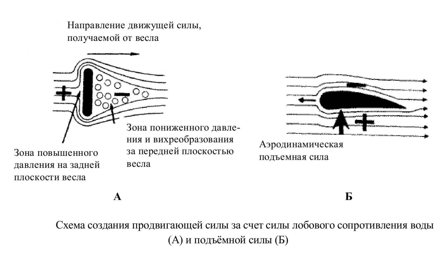 Рассматривая движения пловца, можно сказать, что движение кисти спереди назад и движения ног брассом весельный принцип создания движущей силы. При движении кисти вправо влево, вверх вниз под соответствующим углом по направлению к движению, а также при движении ног в кроле на груди и на спине и в дельфине, используется плавниковый принцип создания движущей силы.