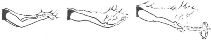 Идеальная форма прерванного вихревого образования более круглая, чем удлиненная. Удлиненный вариант менее эффективен, хотя и образует вызывающий движущую силу поток. Такой вихрь образуется в результате гребка непосредственно назад, а не по криволинейной траектории. Вихревые образования отрываются и отходят с обоих сторон кистей и рук в начале гребка, что часто наблюдается у кролистов спринтеров и плавающих дельфином (рис 10).