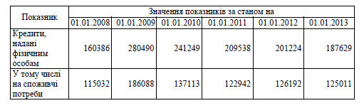 За даними НБУ, за 11 місяців 2014 року загальний обсяг кредитів, виданих банками українським позичальникам, виріс на 4,5 мільярда гривень або на 2,4% - до 192,7 мільярда гривень (Додаток Б). Для порівняння: за 2013 рік обсяг кредитів українців зменшився на 11 мільярдів або 5,5%. Більше того досі, з 2009 року, обсяг кредитування фізосіб щорічно скорочувався (таблиця 3.2)