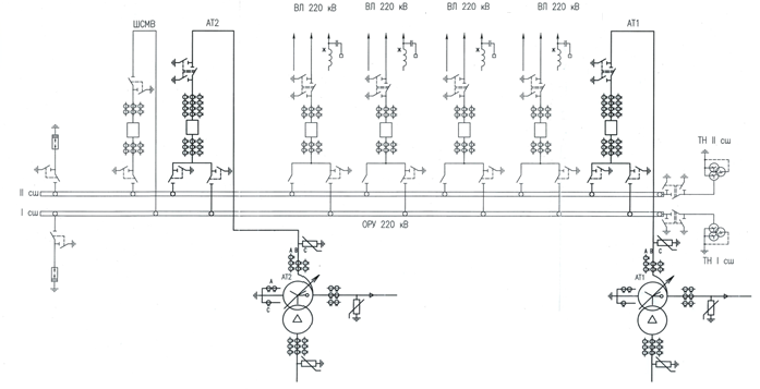 Подстанция является транзитной. Транзит через подстанцию осуществляется со стороны 220 кВ по четырем воздушным линиям, а со стороны 110 кВ по шести. Распределительное устройство низшего напряжения (РУ НН) 10 кВ имеет 20 отходящих линий. Структурная схема подстанции представлена на рисунке 4.