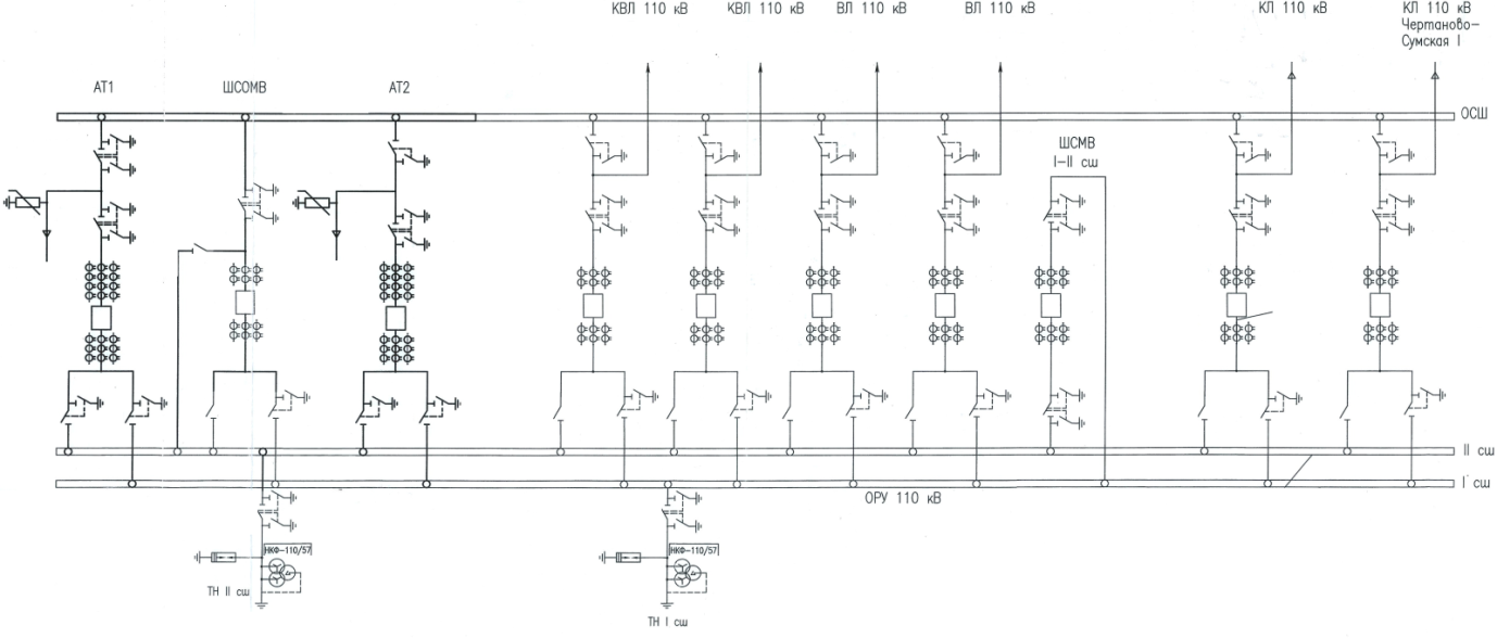 ОРУ среднего напряжения 110 кВ выполнено по схеме «дверабочие с обходной системы шин»